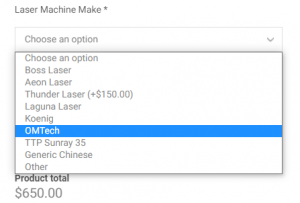 To purchase an OMTech compatible PiBurn, simply go to the PiBurn home page choose your rotary, and select OMtech from the Laser Make dropdown