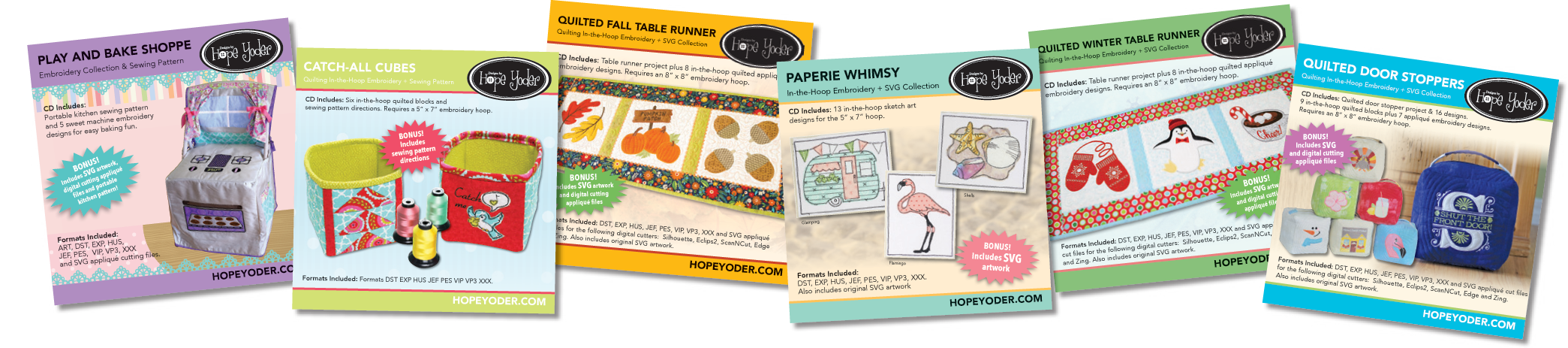 Hope also produces quality sewing patterns, machine embroidery designs, SVG files and has designed several lines of cotton quilting fabric. Her products are sold in hundreds of shops in America, Canada, and Australia.
